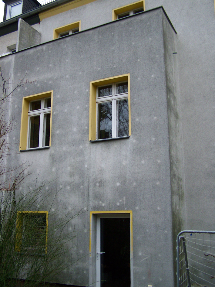 Die 1929 erbaute Doppelhaushälfte wurde in den 90er Jahren energetisch saniert und mit einem Wärmedämmverbundsystem versehen. Die Fassade ist im Laufe der Zeit stark veralgt und stört die ästhetische Wahrnehmung.