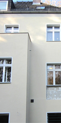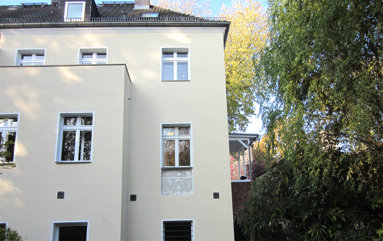 mmrtg|architekten wurden beauftragt die Fassaden zu sanieren. Die Fassaden wurden intensiv gereinigt und im Anschluss mit einer fungiziden und algiziden Siliconharzfarbe überarbeitet. Aufgrund des Ensembleschutzes wurde der Farbton der Fassade in enger Zusammenarbeit mit der Stadtplanung abgestimmt.