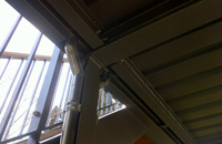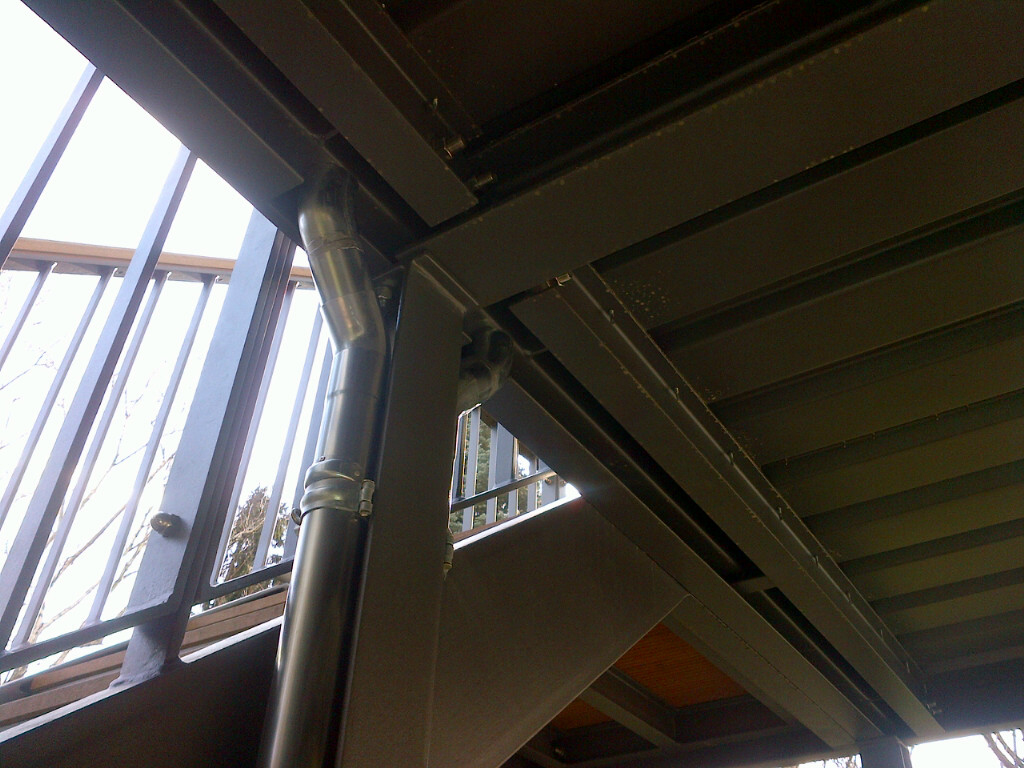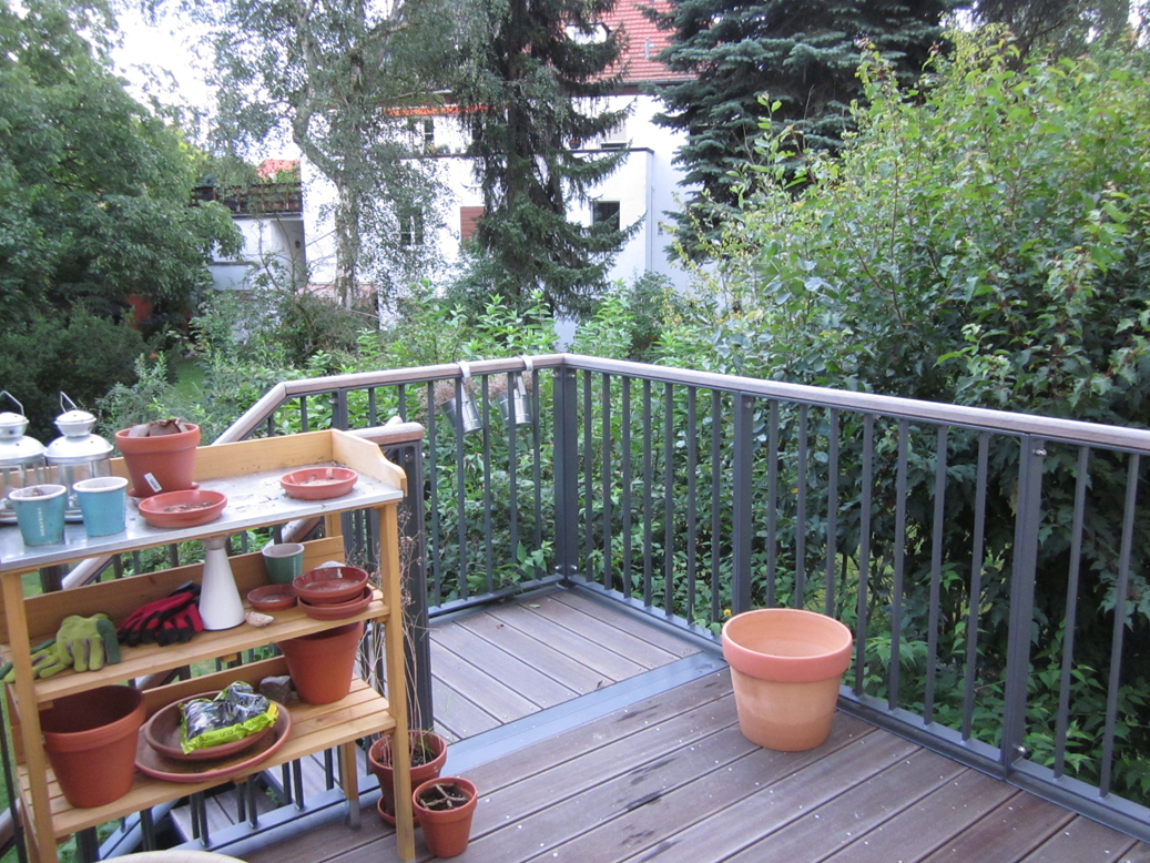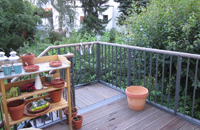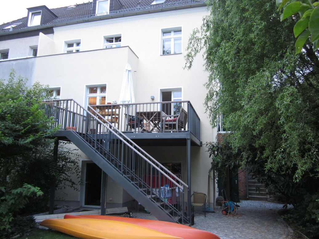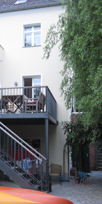 Da das Gelände von der Straßenseite zum Hof hin stark abfällt wurde die Terrasse aufgeständert. Unter Berücksichtigung des Ensembleschutzes und um das Gesamtbild des Objekts nicht zu stark zu beeinträchtigen wurde der Terrassentisch als schlichte, zurückhaltende Stahlkonstruktion ausgeführt. Für die Bodenbeläge und Handläufe kamen hochwertige Holzbeläge zum Einsatz.