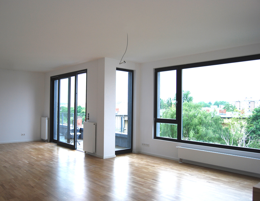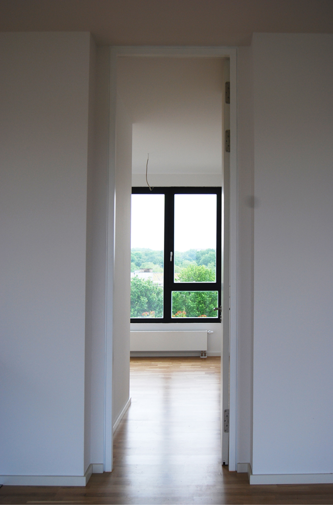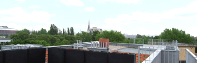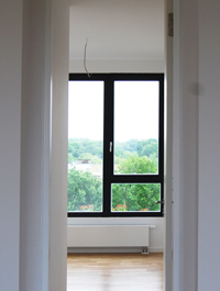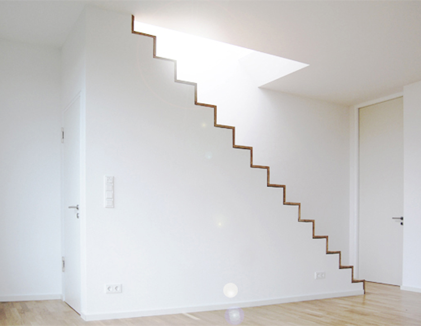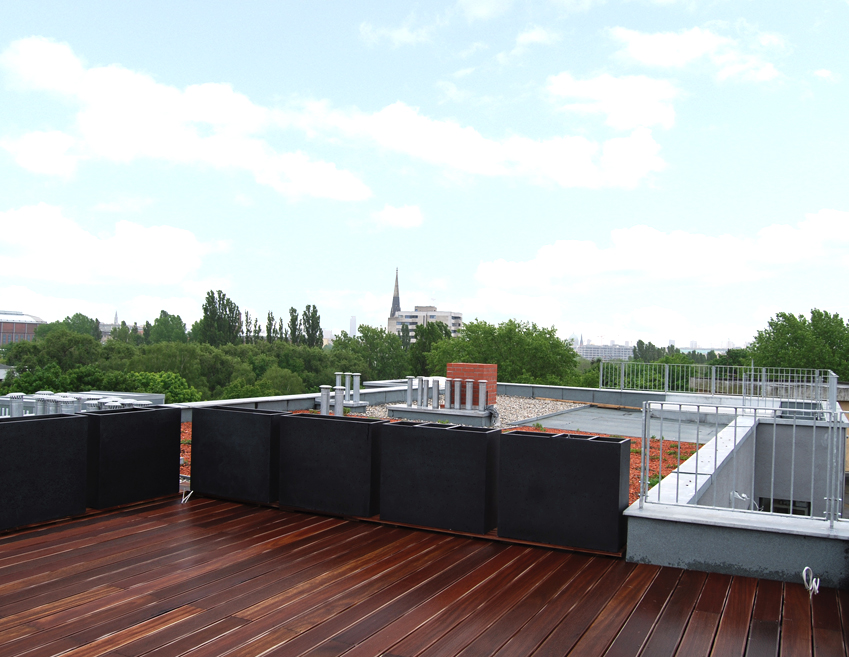 Die Aufstockung verhält sich in Ihrer Kubatur und Größe zurückhaltend, um das Erscheinungsbild des Bestandsgebäudes und das des Gesamtensembles nicht zu stören. Die Terrassenflächen sind wie die bestehenden Balkone nach Westen angeordnet und so dimensioniert, dass keine Verschattung für die darunter liegenden Geschosse entsteht.