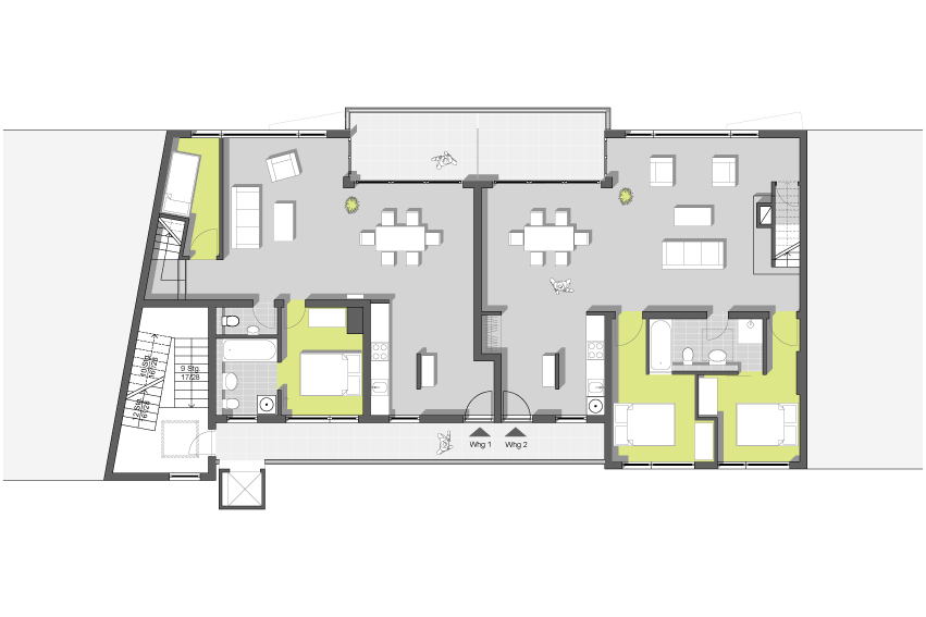 Durch eine eingeschossige Aufstockung soll weiterer Wohnraum geschaffen werden. Der Aufbau beinhaltet zwei Wohneinheiten mit jeweils einer Küche, Wohn/Essbereich, Bad und zwei Schlafzimmern. Des Weiteren sind für die Wohneinheiten je zwei Terrassen vorgesehen, die die Wohnqualitäten erhöhen . Die erste Terrasse ist direkt an den Wohn/Essbereich angeschlossen, die zweite ist intern über eine Treppe zu erreichen und ist als Dachterrasse ausgebildet.