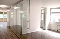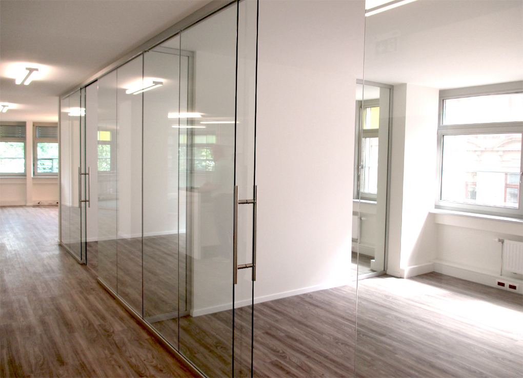 Neben Trockenbauwänden zur Gliederung der Flächen kamen auf allen Etagen hochwertige Glastrennwandsysteme zum Einsatz.