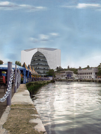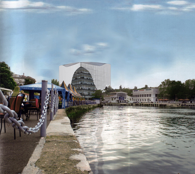 Das Kaufhaus liegt an exponierter Stelle am Hafen und erscheint vom Meer