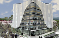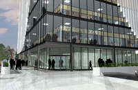 mit sieben Vollgeschossen. Über den diagonal angebrachten Eingängen bildet die