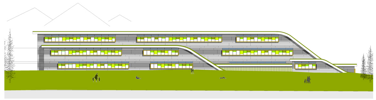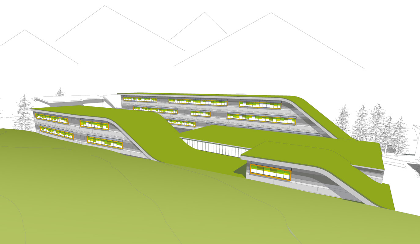 Die geschwungenen Wellenberge der einzelnen Gebäudeteile sind aus der Berglandschaft