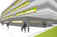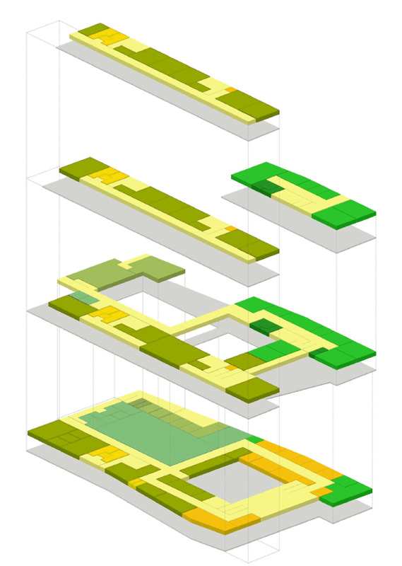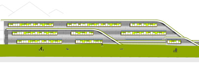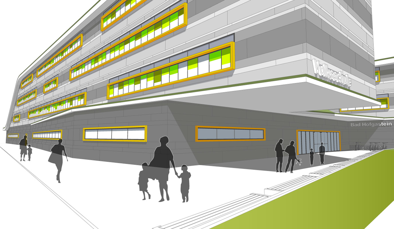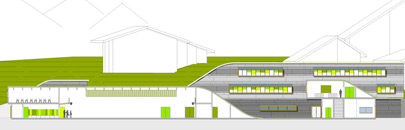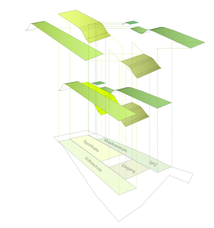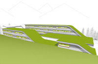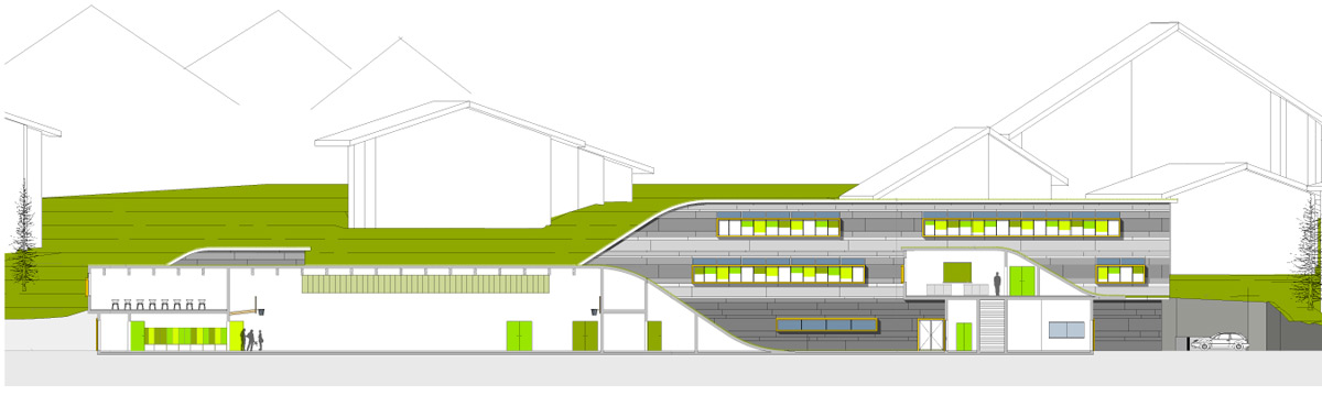 wird das Thema des Berges und seines Aufbaus weiter verarbeitet. Durch die Belegung der Fassaden mit Schieferplatten